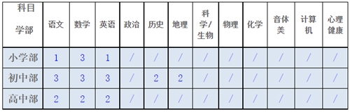 1、小學(xué)、初中、高中所需科目及人數(shù)見下表:
