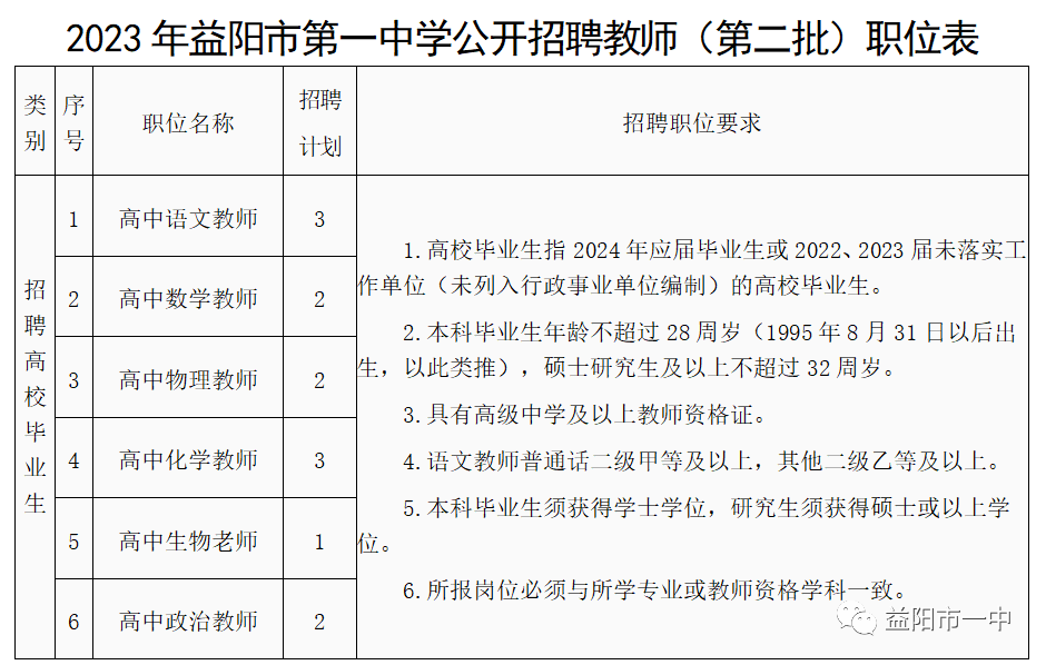 2023年益陽市第一中學面向高校畢業(yè)生公開招聘教師13名(第二批),均為全額撥款事業(yè)編制。招聘職位名稱、計劃與職位要求詳見《2023年益陽市第一中學公開招聘教師(第二批)職位表》(附件1)。