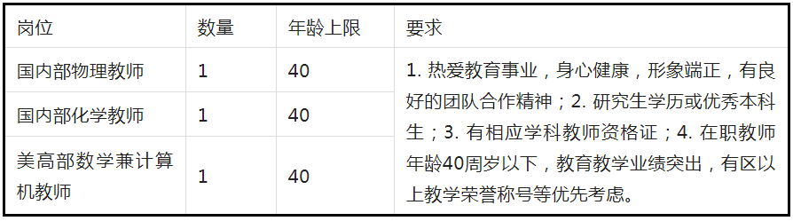 根據(jù)學(xué)校發(fā)展需要,2023學(xué)年擬向社會(huì)擬招聘物理、化學(xué)、數(shù)學(xué)兼信息教師各1名。歡迎優(yōu)秀在職教師和應(yīng)屆畢業(yè)生,以及有海外學(xué)習(xí)和工作經(jīng)驗(yàn)的教師加盟。(有雙語(yǔ)教學(xué)經(jīng)驗(yàn)或者能力者優(yōu)先)