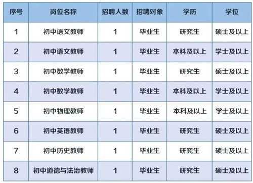 根據(jù)學(xué)校發(fā)展需要,擬面向全國招聘優(yōu)秀應(yīng)屆畢業(yè)生8人,被錄用者將納入公辦學(xué)校教師編制,工資待遇由市財(cái)政統(tǒng)發(fā)。具體崗位和要求如下: