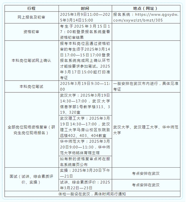 本科崗位為筆試+面試;研究生崗位為面試。面試形式包括試講、綜合素質(zhì)評價、實操等,考點設(shè)在武漢,具體面試安排另行通知。其中音樂、體育、美術(shù)、信息技術(shù)、心理、通用技術(shù)和中職專業(yè)課教師需實操。